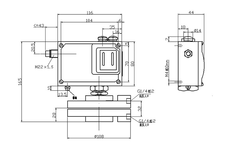 520M/7DD防爆差壓開關(guān)外形尺寸及安裝尺寸(單位:mm)