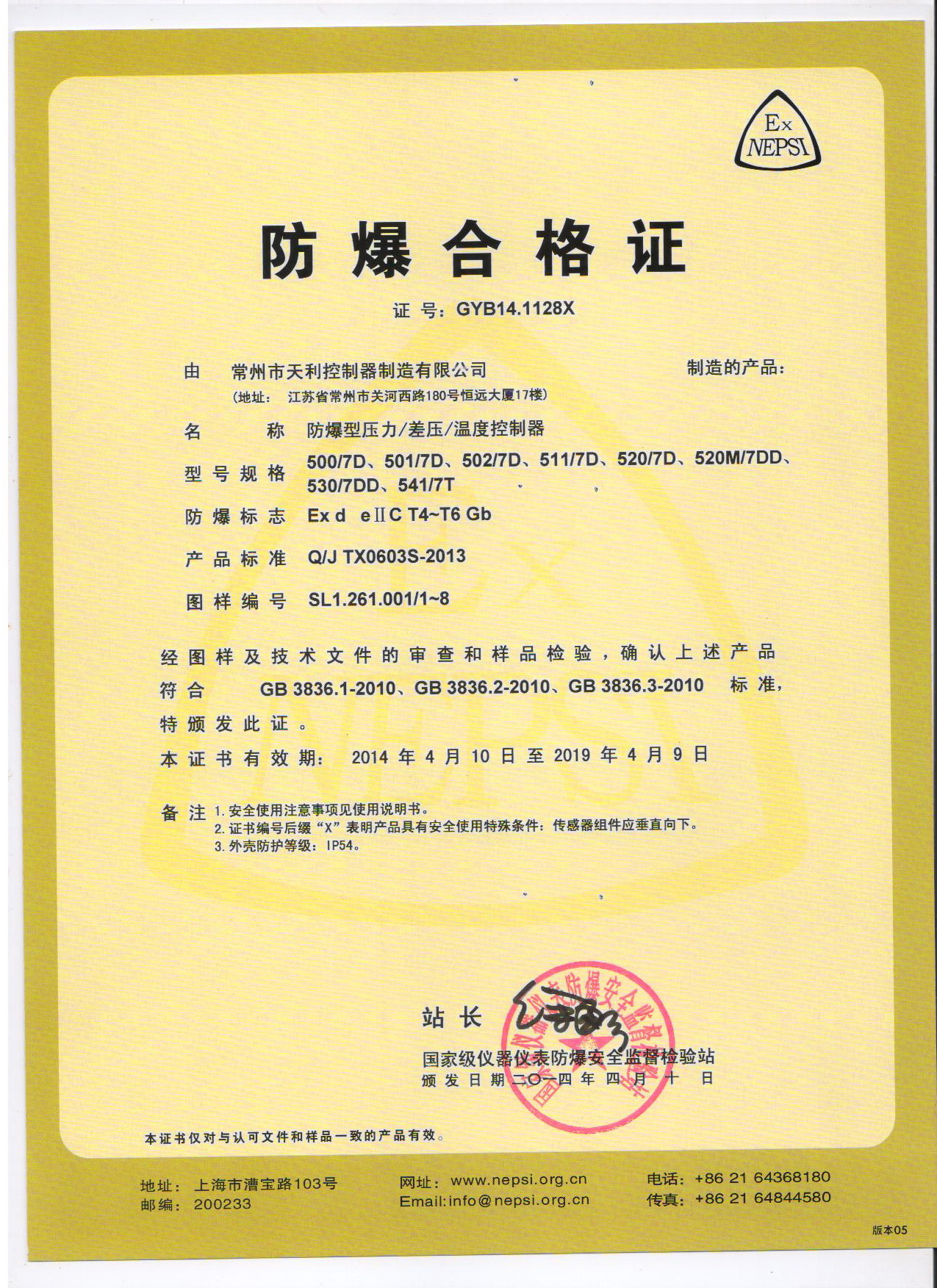 今天小編給大家介紹下本公司的防爆壓力開關,本公司的防爆壓力開關有專業(yè)機構的認證,下面是證書,可以放心使用。